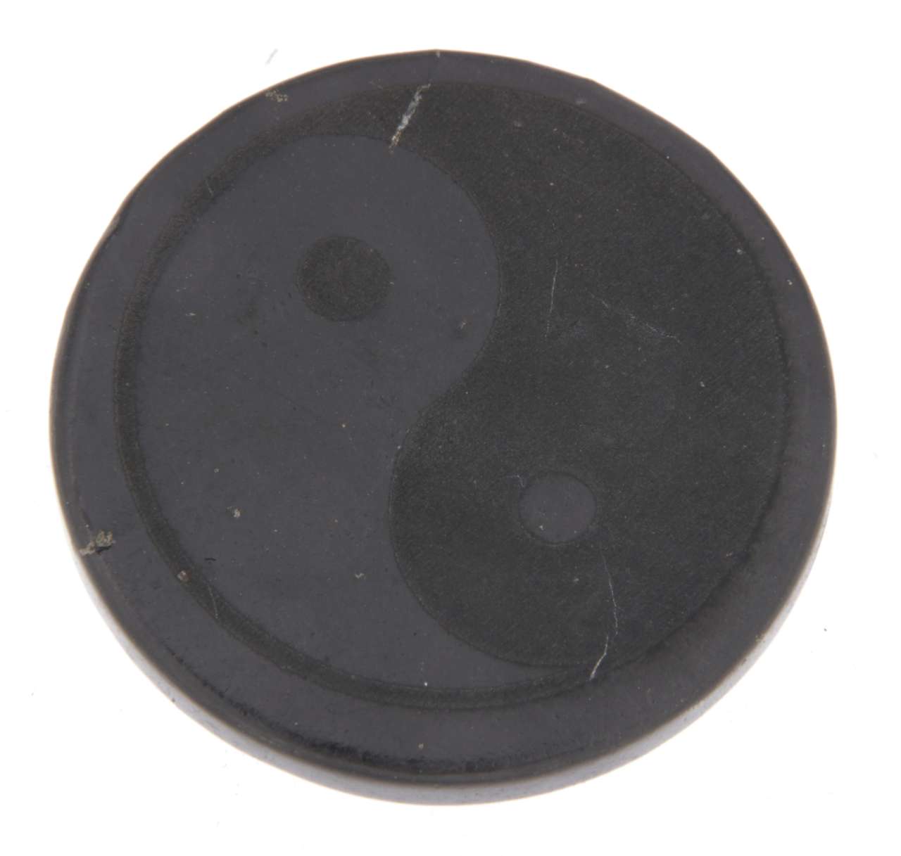 Das traditionelle Zeichen für Gleichgewicht und Harmonie kommt auf der tiefschwarzen, glatten Oberfläche des Schungits besonders schön zur Geltung.
