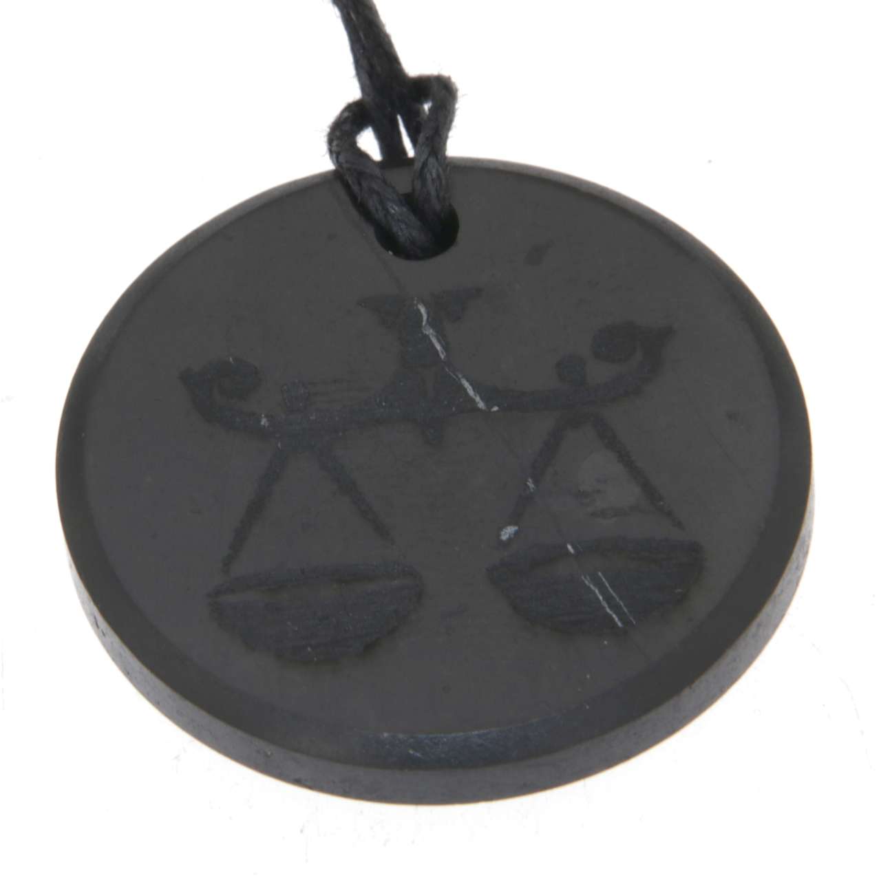 Ein edler Edelsteinanhänger aus echtem Schungit mit fein eingraviertem Sternzeichen „Waage“, handgefertigt und einzigartig in seiner natürlichen Eleganz.