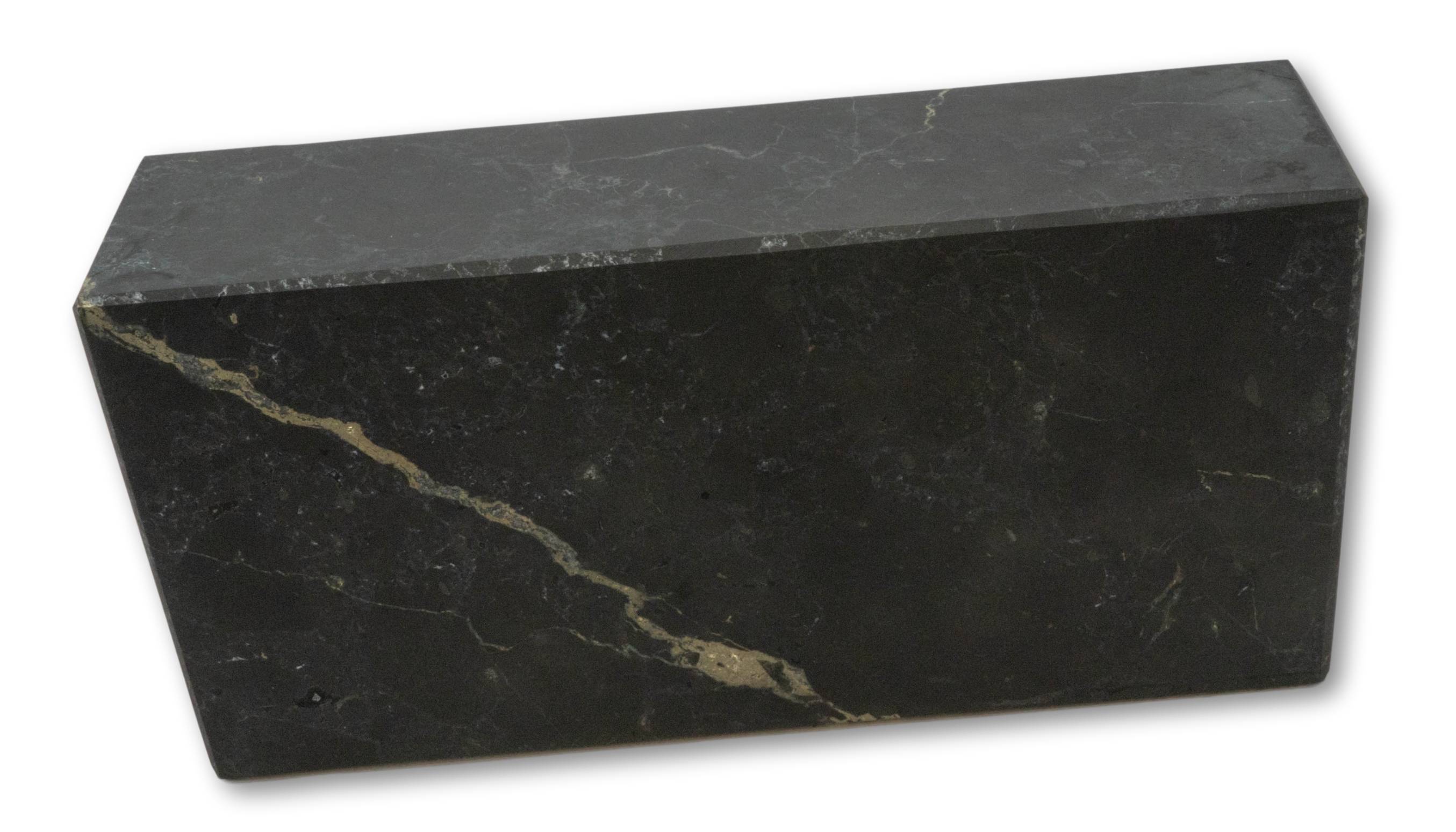 Mit seinen Maßen von ca. 20 × 10 × 5 cm und einem Gewicht von etwa 2300 g ist der Schungit Ziegelstein massiv und stabil.