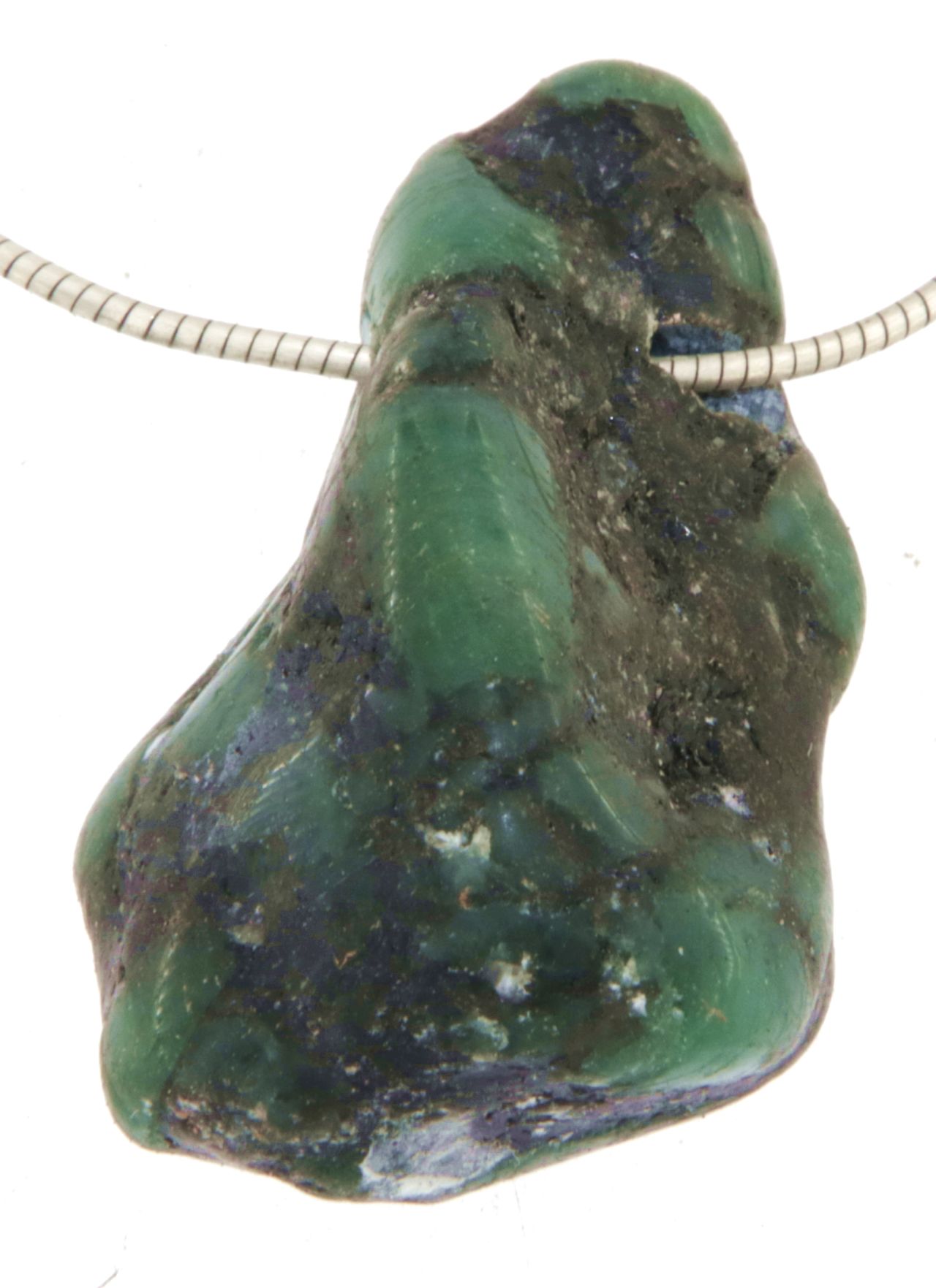 Ein eleganter Edelstein-Schmuckanhänger aus echtem Smaragd, gefertigt aus einem polierten Trommelstein mit natürlicher Struktur und satter, grüner Farbgebung. Der Smaragd zeigt feine, typische Einschlüsse und leichte Farbvariationen, die jedes Stück zu einem einzigartigen Natur-Unikat machen.