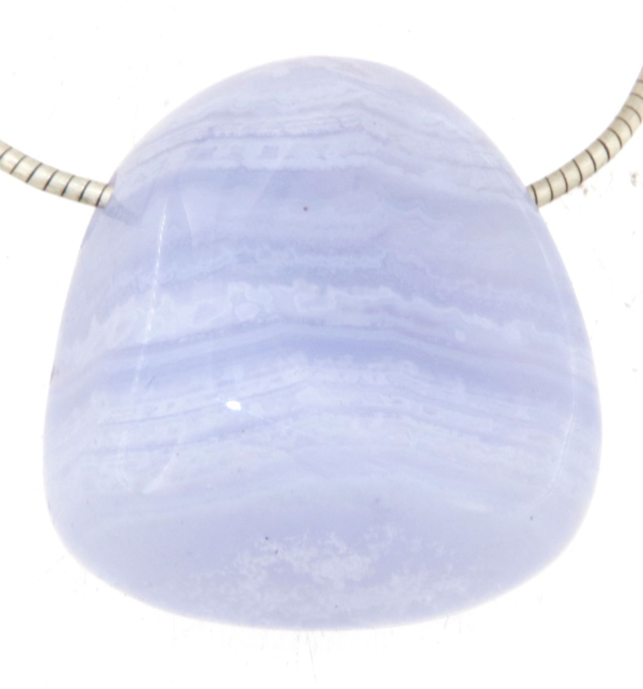 Sie erhalten genau den abgebildeten blauen Chalcedon-Trommelsteinanhänger – ein natürlich schönes und elegantes Einzelstück.