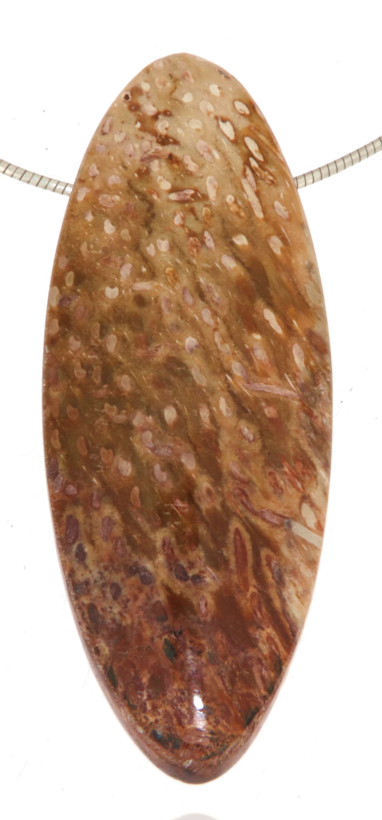 Die natürlichen Farbtöne von Braun, Beige, Grau und warmem Rot verleihen dem Stein Tiefe und Ausdruckskraft. Jeder Anhänger ist ein echtes Unikat, das Natur und Zeit in sich vereint.