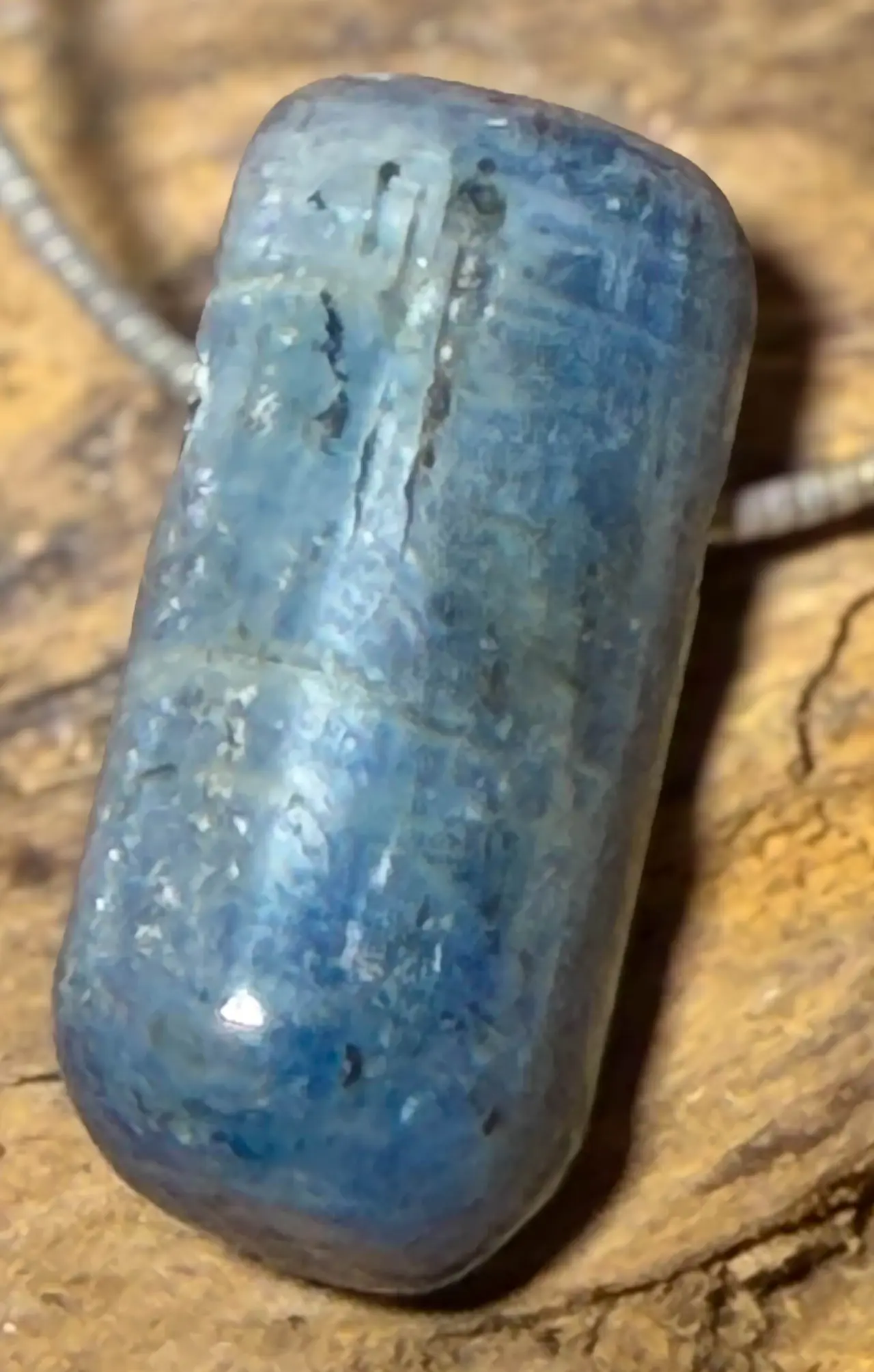 Ein eleganter Edelstein-Schmuckanhänger aus echtem Kyanit (Disthen), gefertigt aus einem polierten Trommelstein mit intensiv blauem Farbton und feinem seidigem Glanz. Der Kyanit zeigt eine charakteristische, natürliche Schichtung, die ihm Tiefe und Ausdruck verleiht – jedes Stück ist ein einzigartiges Natur-Unikat.