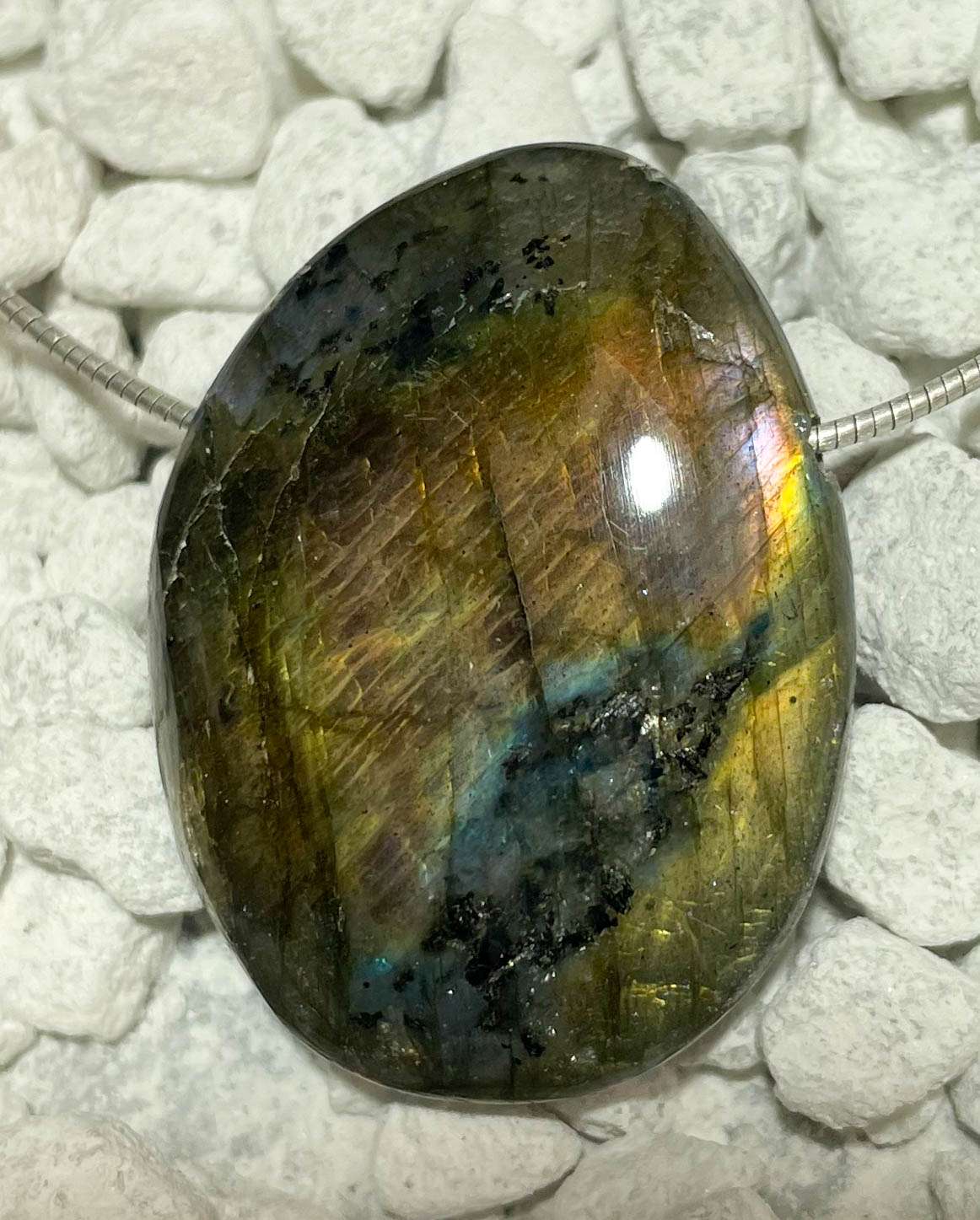 Ein faszinierender Edelsteinanhänger aus Labradorit, der durch sein charakteristisches Farbspiel – das sogenannte Labradoreszieren – beeindruckt.