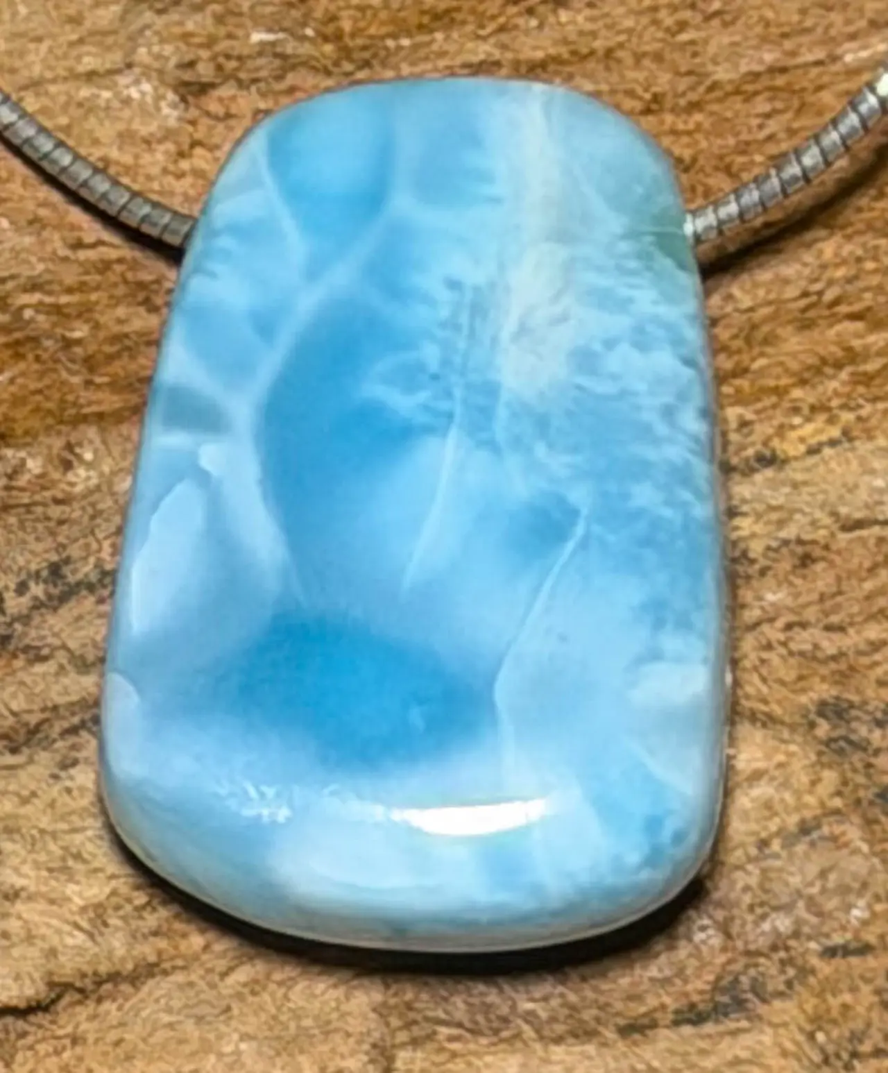 Ein edler Larimar-Anhänger, der durch sein zartes Blau-Weiß und seine natürliche Maserung begeistert.