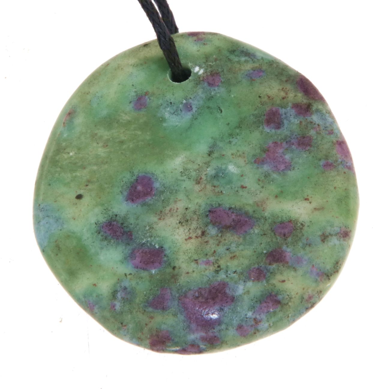 Ein außergewöhnlich schöner Edelsteinanhänger aus Rubin-Fuchsit, kunstvoll poliert und sorgfältig ausgewählt. Dieser seltene Naturstein besticht durch seine einzigartige Kombination aus grünem Fuchsit mit eingelagerten rubinroten Kristallen, die ihm ein faszinierendes Farbspiel verleihen.