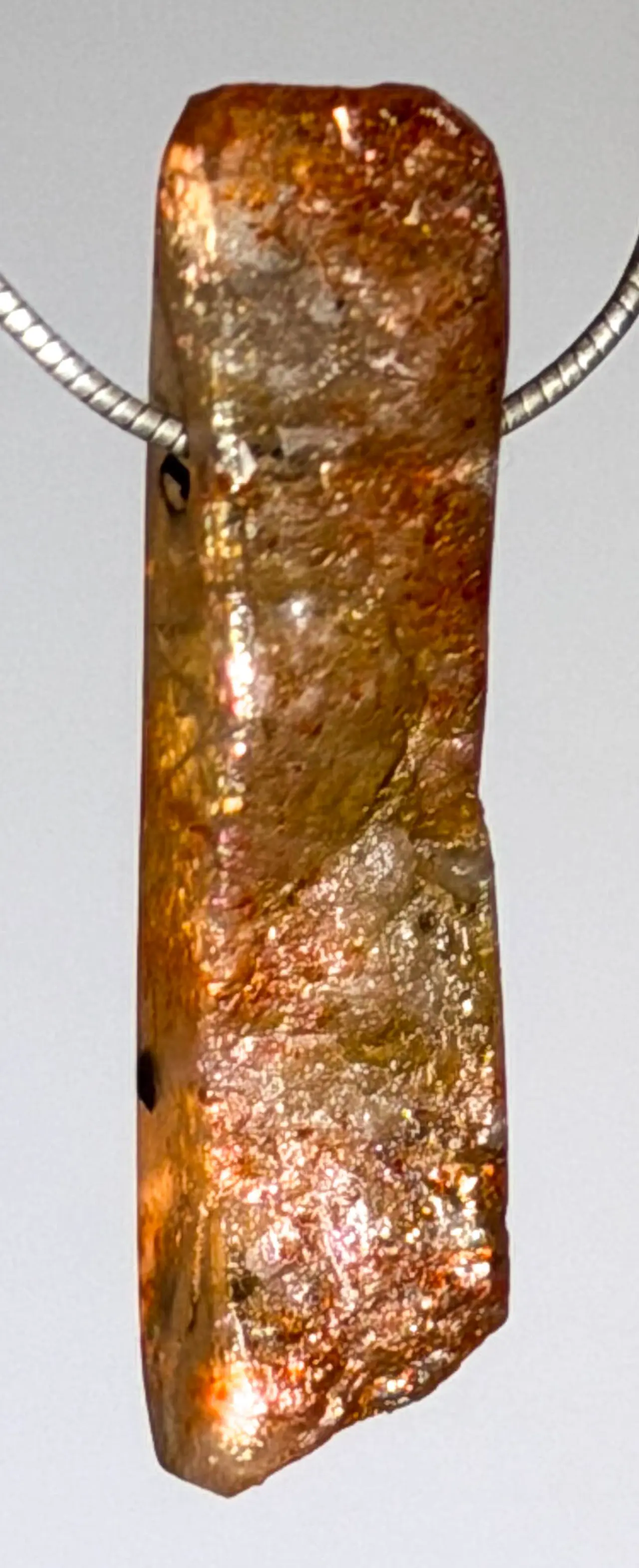 Mit einer Größe von ca. 43 x 10 mm ist dieser Anhänger ein harmonisch proportioniertes Schmuckstück, das durch seine warme Ausstrahlung und sanften Farbreflexe besticht.