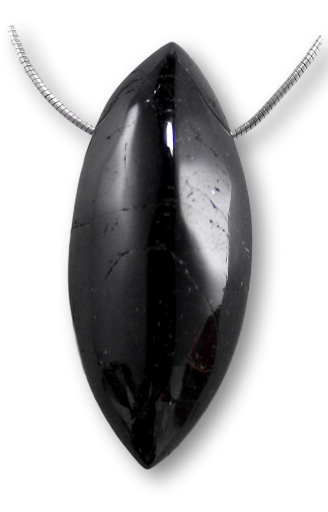 Edelsteinanhänger aus schwarzem Turmalin / Schörl – Navetteform mit Stoffband