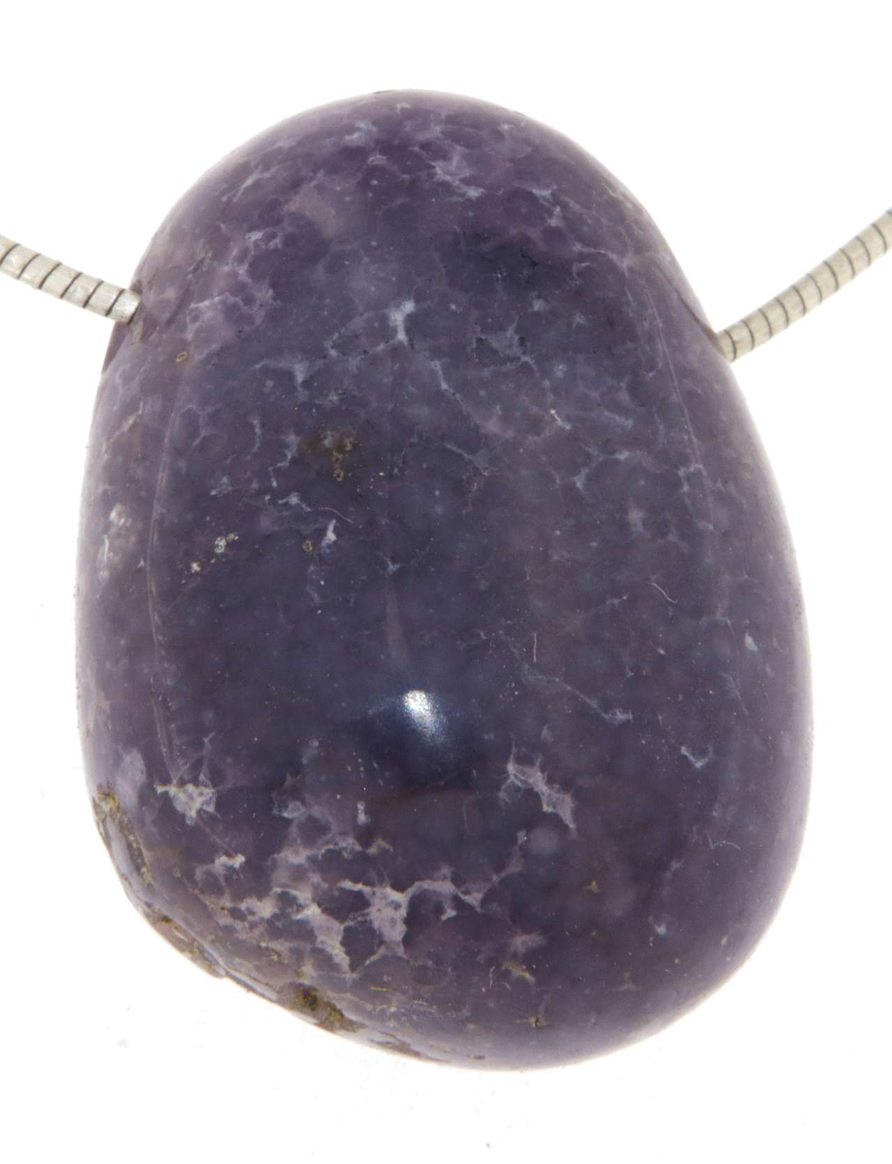 Ein edler Edelstein-Schmuckanhänger aus echtem Trauben-Chalcedon, gefertigt aus einem polierten Trommelstein mit feiner, natürlich gewachsener Struktur. Der Trauben-Chalcedon zeigt die für diesen Stein typischen bläulich-violetten bis grauen Farbtöne mit zarter, kugeliger Oberfläche, die an kleine Trauben erinnert. Jeder Anhänger ist ein Unikat der Natur, individuell in Form, Farbe und Textur.