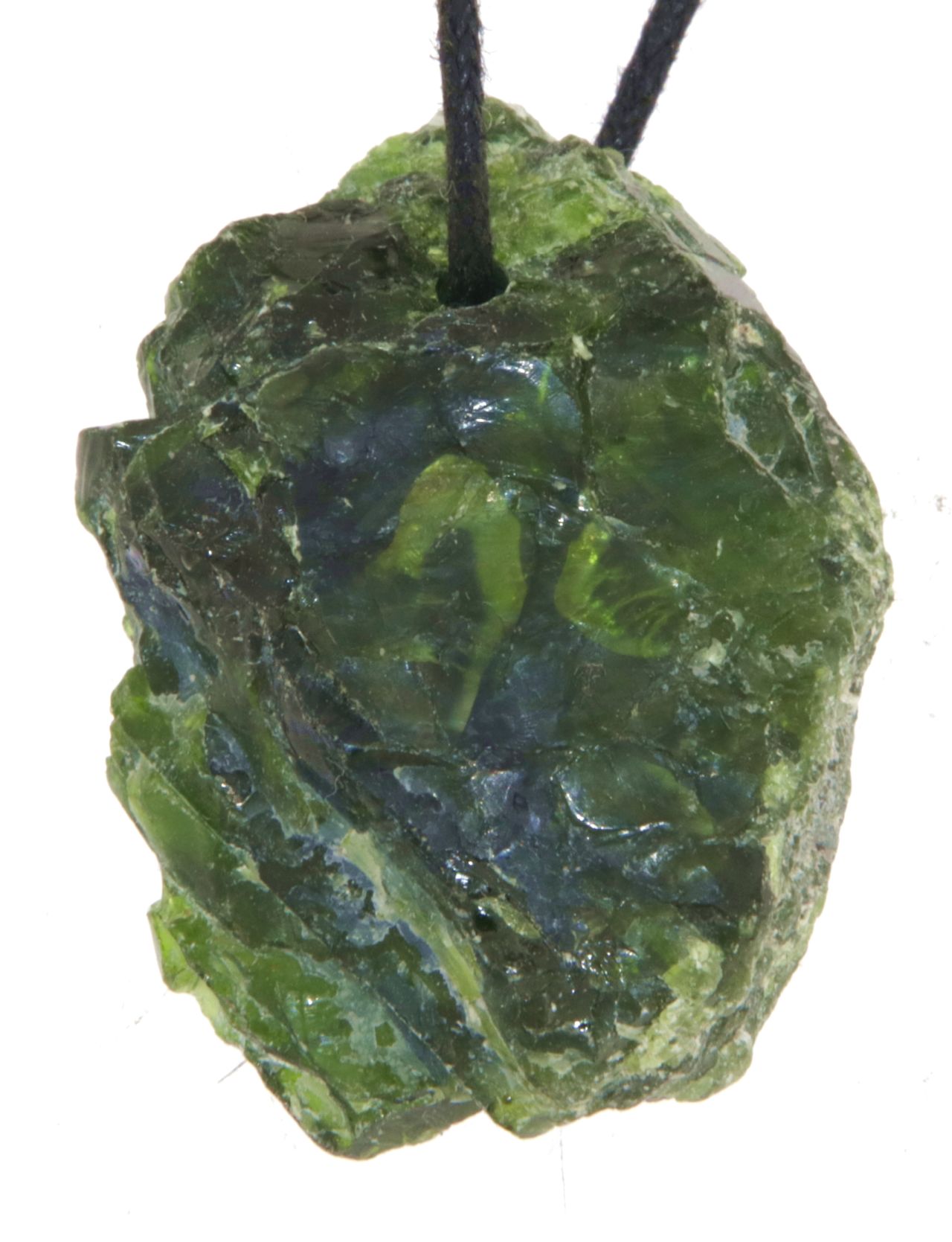 Der Chromdiopsid Trommelstein misst ca. 40 × 30 mm und besitzt eine Bohrung von ca. 2,5 mm, die für Lederbänder, Omegareife oder feine Silberketten geeignet ist.