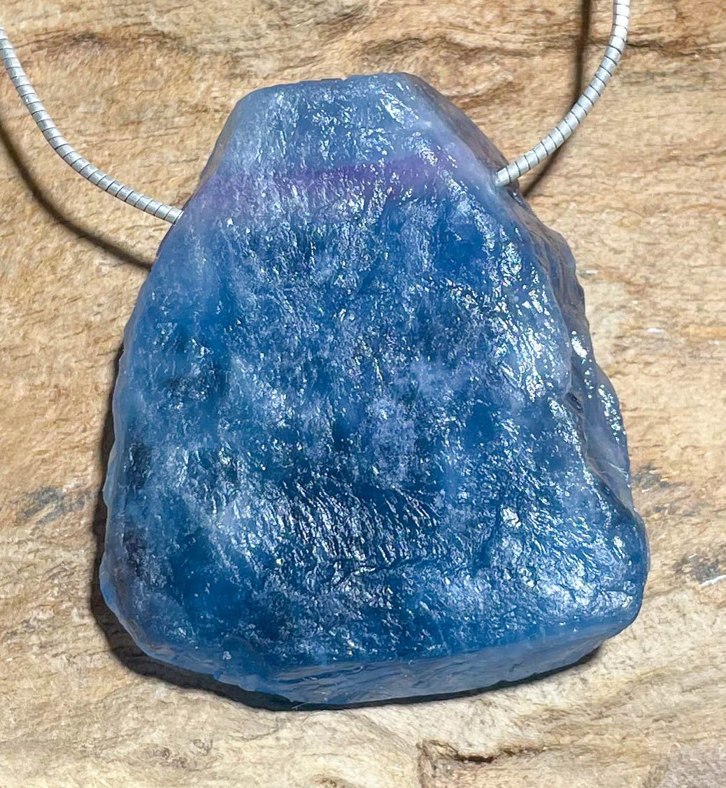 Ein außergewöhnlicher Edelsteinanhänger aus blauem Fluorit in Rohstein-Qualität – ursprünglich, kraftvoll und voller natürlicher Struktur. Die ungeschliffenen, kristallinen Flächen bewahren den authentischen Charakter des Minerals und lassen die Blau- und Aquatöne des Fluorits besonders intensiv wirken.