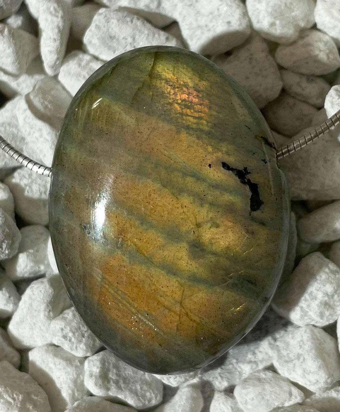 Edelstein-Trommelstein-Anhänger aus Labradorit – handpoliert mit Stoffband