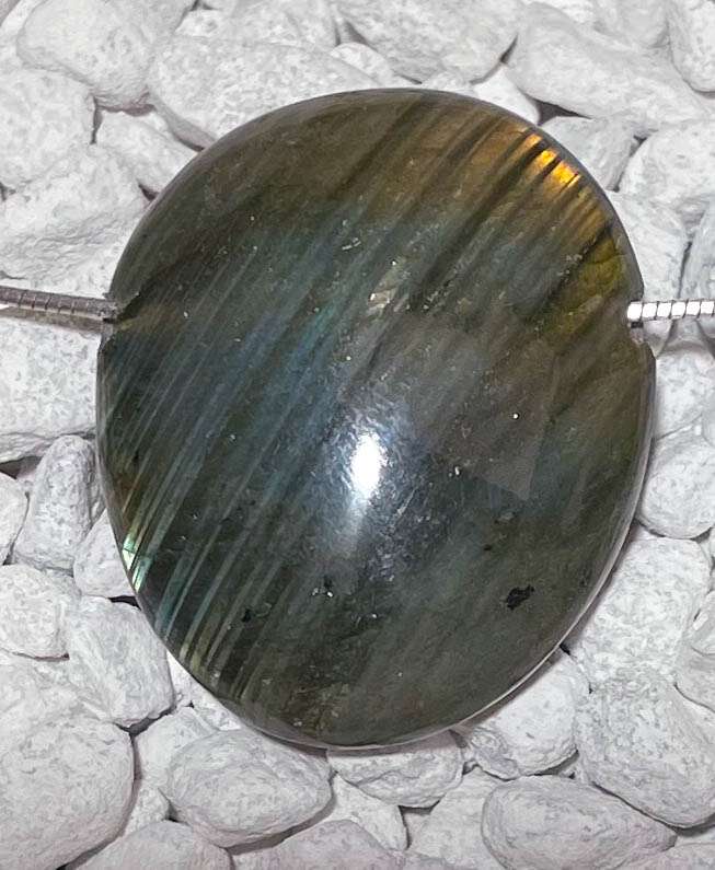 Der Edelstein zeigt je nach Lichteinfall die charakteristische Labradoreszenz – einen faszinierenden Glanzeffekt, der jeden Stein zu einem einzigartigen Naturunikat macht.