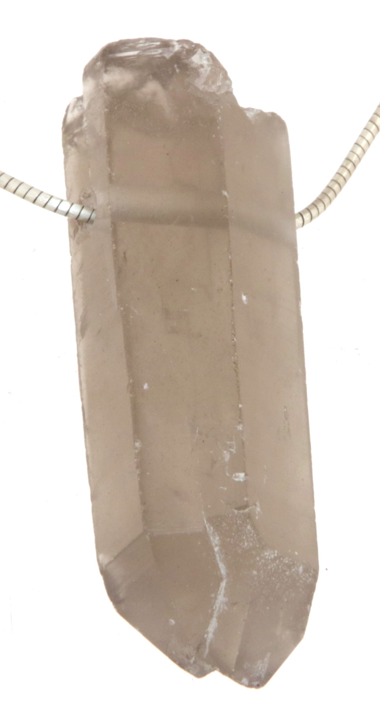 Ein authentischer Edelsteinanhänger aus naturbelassener Rauchquarz-Spitze, bei dem die ursprüngliche Kristallform erhalten geblieben ist. Das warme, transparente Braun des Rauchquarzes kombiniert sich mit der gewachsenen, leicht unregelmäßigen Spitzenstruktur zu einem kraftvollen und natürlichen Gesamtbild.