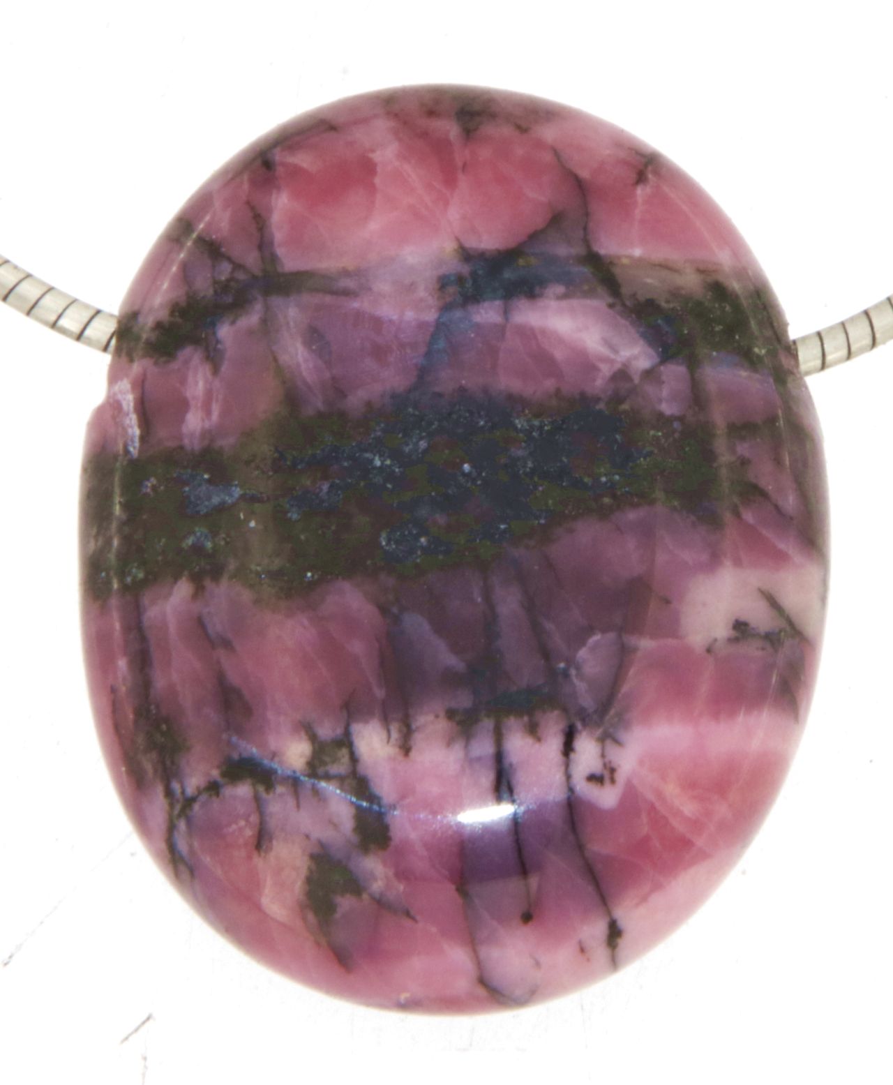 Ein wunderschöner Rhodonit-Anhänger, der durch sein zartes bis kräftiges Rosa mit dunklen Adern und Strukturen beeindruckt.