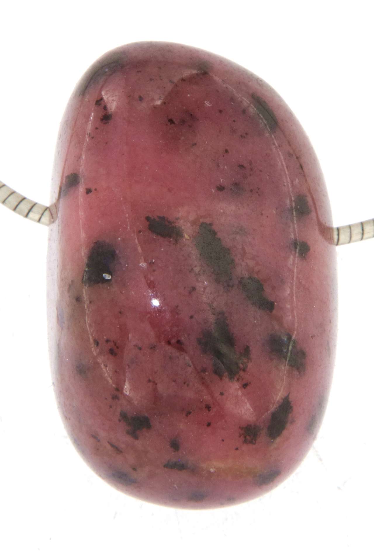 Ein wunderschöner Rhodonit-Anhänger, der durch seine warmen Rosatöne und die charakteristischen schwarzen Adern sofort auffällt.