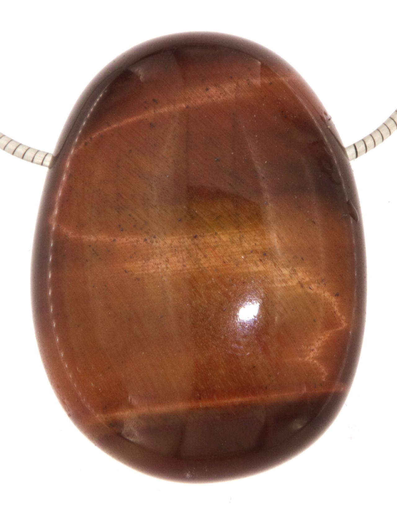 Ein faszinierender Edelsteinanhänger aus rotem Tigerauge, der mit seiner warmen, rötlich-braunen Farbgebung und dem charakteristischen Glanz beeindruckt. Durch das besondere Lichtspiel entsteht der typische Katzenaugeneffekt, der dem Stein Tiefe und Lebendigkeit verleiht.