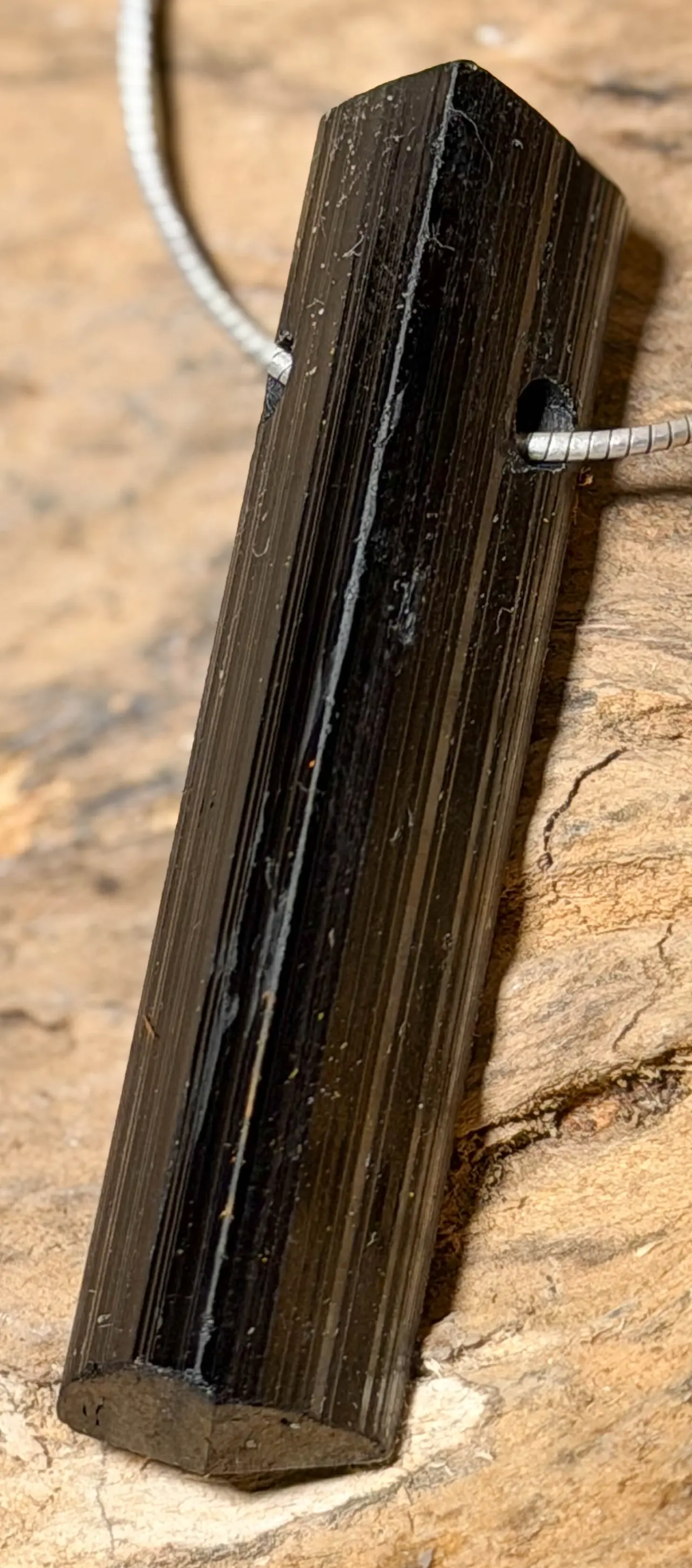 Ein beeindruckender Edelsteinanhänger aus schwarzem Turmalin (Schörl) in natürlicher Kristallform. Die längliche, klare Struktur und die tiefschwarze Farbe verleihen diesem Anhänger eine kraftvolle, ausdrucksstarke Präsenz. Jeder Kristall ist ein naturbelassenes Unikat mit markanter Oberfläche und intensiver Ausstrahlung.
