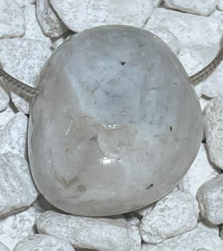 Der handpolierte Trommelstein zeigt eine milchig-weiße Grundfarbe mit irisierenden Lichtreflexen in Blau, Silber und gelegentlich Gold – das charakteristische Mondlichtspiel (Adulareszenz), das ihn zu einem der beliebtesten Edelsteine macht.