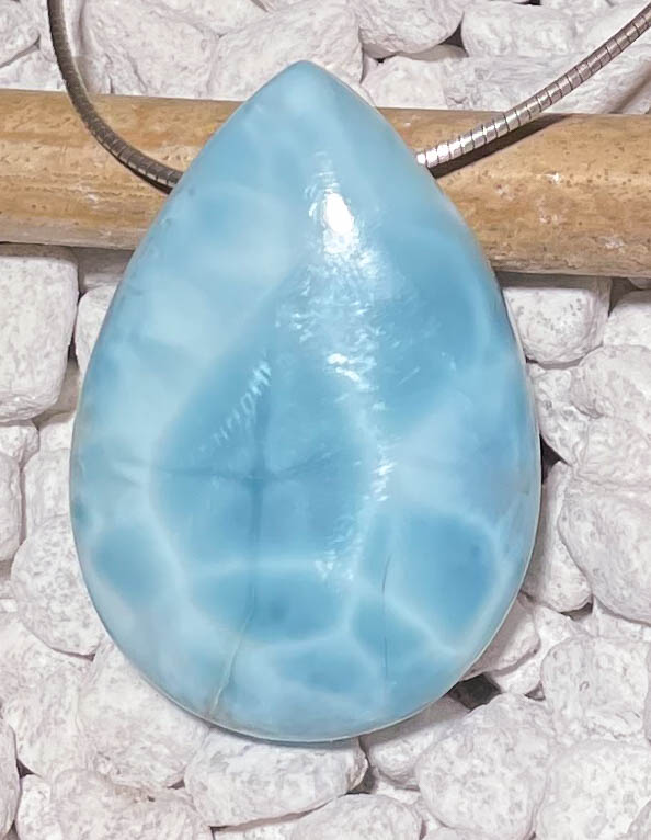 Ein eindrucksvoller Larimar-Anhänger, dessen leuchtendes Himmelblau und die harmonischen Weiß- und Türkisstrukturen sofort ins Auge fallen. Dieser seltene Edelstein stammt aus der Dominikanischen Republik und zählt zu den begehrtesten Schmucksteinen weltweit.