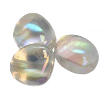 Der Angel Aura ist ein außergewöhnlich schöner Edelstein, der durch seine irisierende, regenbogenfarbene Oberfläche und zarte Lichtreflexe besticht. Grundlage dieses faszinierenden Steins ist meist klarer Bergkristall, der durch eine feine Bedampfung mit Edelmetallen wie Platin und Silber seine schimmernde Aura-Färbung erhält. Das Ergebnis ist ein schillernder Edelstein, der wie von einem sanften Licht überzogen wirkt.
