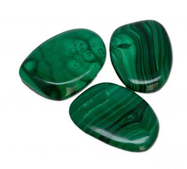 Der Malachit ist ein außergewöhnlich schöner Edelstein, der durch seine markanten, wellenförmigen Bänderungen in leuchtendem Grün besticht. Seine charakteristische Maserung macht jedes Stück zu einem echten Einzelstück der Natur. Die Steine in A-Qualität sind glatt geschliffen, poliert und zeigen das volle Farbspiel des Malachits – von hellem Smaragdgrün bis zu tiefem Tannengrün.
