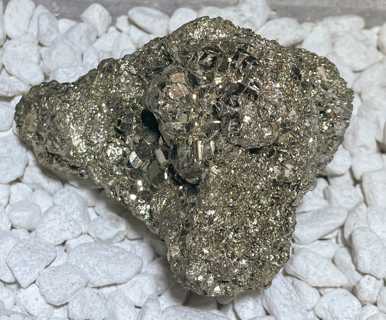 Diese außergewöhnliche Pyrit-Stufe aus Peru beeindruckt durch ihren intensiven, goldfarbenen Glanz und ihre charakteristische Kristallstruktur.